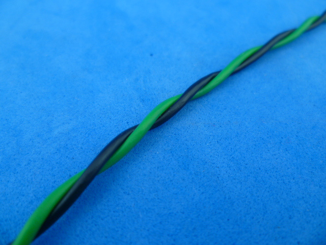 Draad 'twisted pair', twee draden 0,5 mm2 in elkaar getwist, zwart en lichtgroen. Ongeveer 50 'twists' per meter. Dit draad wordt gebruikt voor o.a. can-bus bedrading en soortgelijke signaalleidingen met symetrische signalen. Door het twisten is het de bedoeling dat van buitenaf opgepikte storingen zichzelf opheffen.