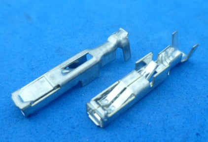 Female kontakt met onbekende toepassing. Een mannetje van 2,8 x 0,8 past er mooi in (iets breder zal ook nog gaan). Lengte totaal 21,4 mm. Afmetingen vooraan 4,02 x 2,80 mm. Net daarachter 4,02 x 3,85 mm. Naar binnen gebogen weerhaakje. Afstand tussen voorkant en aangrijppunt van het weerhaakje is ongeveer 12,7 mm.