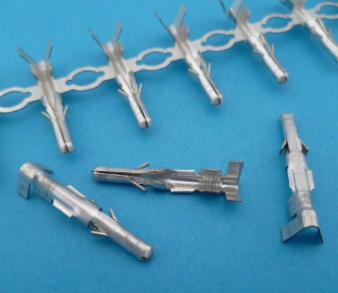 Ongeveer 2,36 mm rond. Twee weerhaakjes. Voor draad AWG 14-20, dat is ongeveer 0,5 - 2,0 mm2. (zelf denk ik dat 1,5 mm2 het maximum is). Lengte 22 mm. De afstand tussen voorkant kontakt en aangrijppunt weerhaakje is 8,5 mm. Geleverd aan reel, zie bovenin foto. Ze zijn niet gemakkelijk los te knippen.