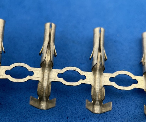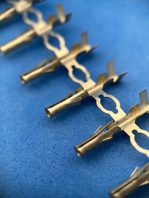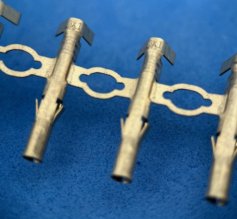 Uitwendig ongeveer 2,0 - 3,0 mm rond, past op het male kontakt 2,36 mm. Twee weerhaakjes. Voor draad AWG 14-20, dat is ongeveer 0,5 - 2,0 mm2 (zelf denk ik niet meer dan 1,5 mm2). Lengte 22 mm. De afstand tussen voorkant kontakt en aangrijppunt weerhaakje is 8,4 mm. Geleverd aan reel, zie bovenin foto. Ze zijn niet gemakkelijk los te knippen.