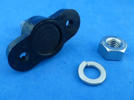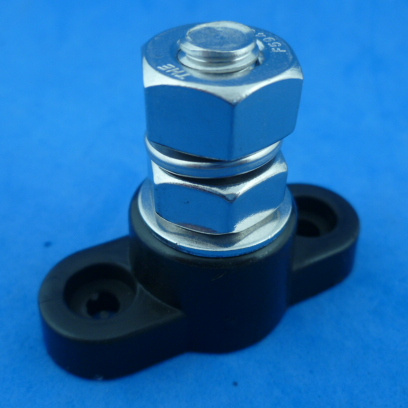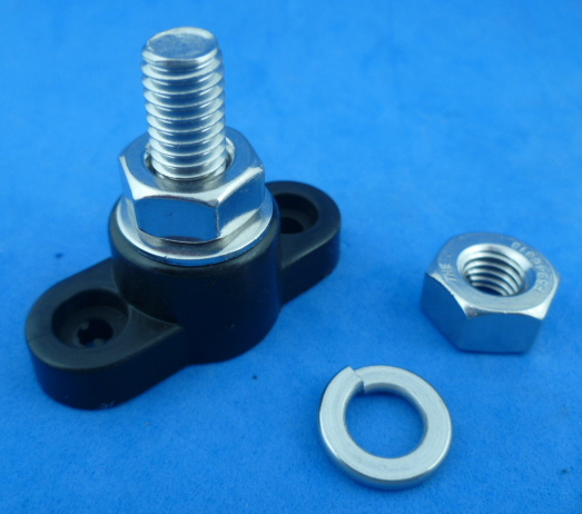 Verdeelblok met 1 bout van 10 mm zwart. Afmetingen: 54mm lang, 25mm breed, 42mm hoog. Afstand montagegaten 35mm. Montagegaten zijn 5mm. Bout is ongeveer 10 mm. De schroefdraad is niet metrisch, en ook de sleutelmaat ook niet. De moer is 17,4 mm, aandraaien met 6-kant dop van 18 mm is denk ik het beste. Bout is RVS, de moeren verwacht ik ook. De kunststof montageplaat is aan de onderzijde niet open dus geen kans op kortsluiting naar het montagevlak. Redelijk stevig kunststof maar de onderste moer vasthouden met een steeksleutel is wel raadzaam.