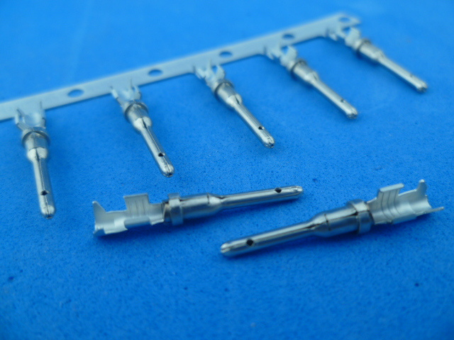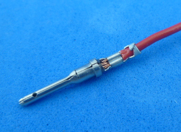 Rond male kontakt, Amphenol AT serie. Artikelnummer van Amphenol is AT60-16-0622. Voor draad 0,5 - 0,8 mm2. Vernikkeld. Max opgegeven stroom is 13A. Lengte losgesneden is ongeveer 21,9 mm. Diameter voorste deel 1,6 mm. Diameter daarachter is 2,6 mm. Diameter van de ronde 'kraag' is 3,35 mm. Geen weerhaakjes. Foto 3 zijn voorbeelden van stekkerhuizen waar dit kontakt in past. Zowel Amphenol als Deutsch.