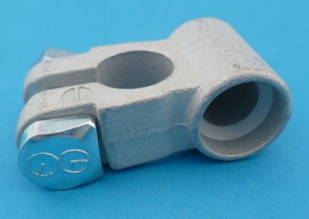 Soldeer accupoolklem voor een standaard min-pool. (de minpool is de dunste). Voor kabel 70 mm2. Bout 8 mm. Diameter van het gat is 12mm, buitenste rand 16mm (zie foto 2). De accupoolklem is dicht aan de andere kant. De pluspoolklem is andersom.