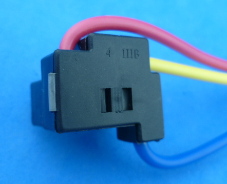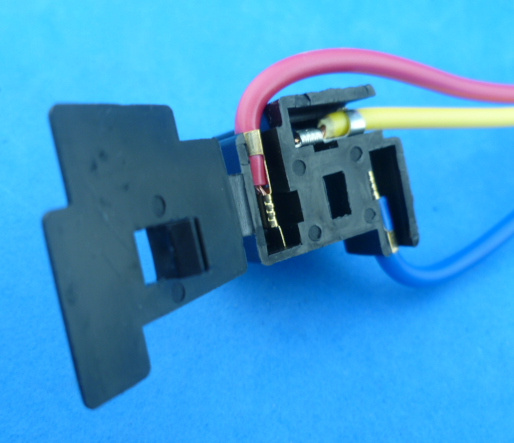 H4 lampstekker met gemonteerde draden van ongeveer 10 cm. Bovenkant van de stekker is dicht. Stekkerhuis met 3 haakse schuifstekkerkontakten voor de 3 male 8,0 x 0,8 mm aansluitingen van de lamp.
