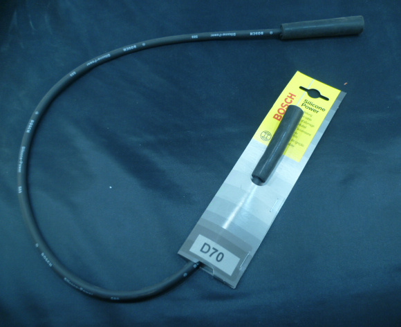 Bosch bougiekabel D70. Lengte incl stekkers is ongeveer 77cm. Ontstoorde bougiekabel ongeveer 10kOhm/meter. Bougiestekker past op bougies met 6mm kopje (de dunste stekker op de foto). Lengte bougiedop is 70mm. De stekker aan de andere kant is bijna gelijk aan de bougiestekker, past ook op de bougie maar de isolator is net wat ruimer, zit niet mooi strak om de bougie.  Onderdeelnummer 0 986 356 058.