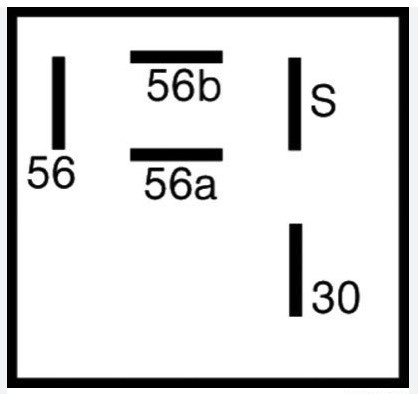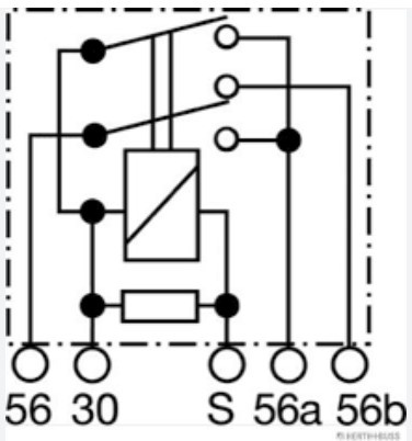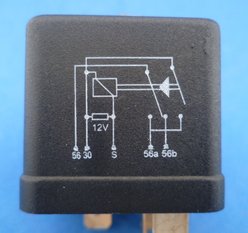 De aansluiting 56 komt van de lichtschakelaar, daar staat spanning op als de koplampen aan staan. Door kort het relais te bekrachtigen (Min op aansluiting S) schakelt het relais om tussen 56a (groot licht) en 56b (dimlicht). Het relais schakelt mechanisch om. Blijft dus in dezelfde stand staan als alle spanning eraf gaat.