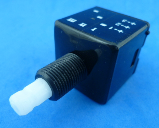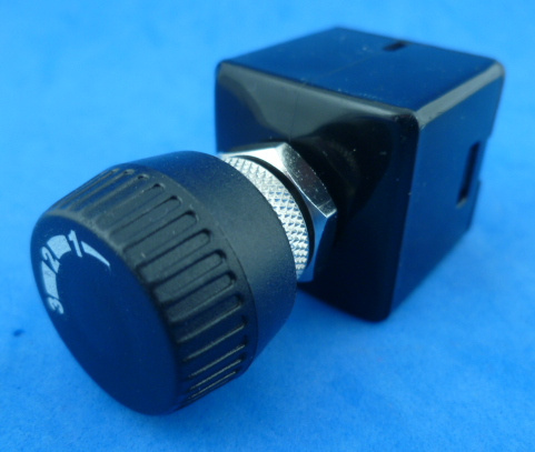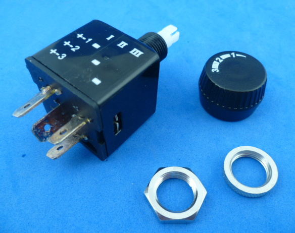 Draaischakelaar met 4 standen, uit - 1- 2 - 3. De aansluiting '+' wordt in de standen 1 - 3 doorverbonden met desbetreffende aansluiting of niet doorverbonden in de stand 'uit'. De stand uit is helemaal linksom.