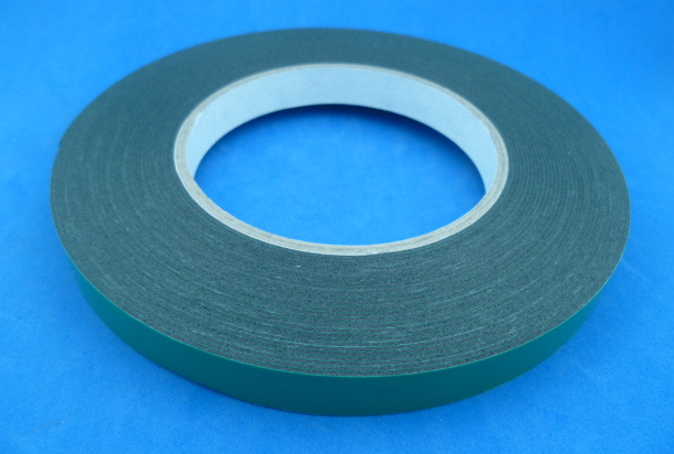 Dubbelzijdig klevende foam tape, 12 mm breed, 10 meter lang. Opgewikkeld met groene beschermfolie ertussen. Merkloze tape, plakt goed op mooie gladde oppervlakken. Dikte ongeveer 0,8 mm. Verdere gegevens: adhesion strength 200kgs/m2, +70°C, UV resistant, water resistant.