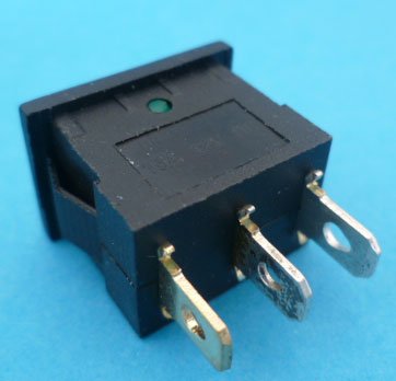kleine schakelaar groen verlicht, 12V/10A. Klemmontage in gat 13*19 mm. Aansluiten met drie 4.8 x 0,8 mm stekkers. inbouwdiepte 22 mm zonder stekkers erop. Met 1 en 0 symbool.
