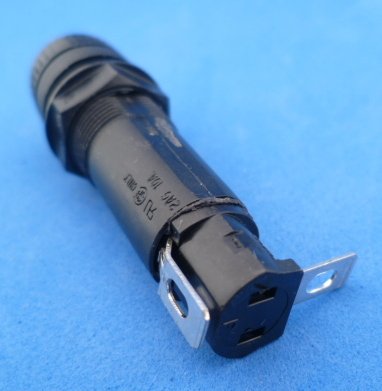 Paneelzekeringhouder voor 6,3 x 32 mm glaszekeringen. Dop met bajonetsluiting en de letters 'fuse' erop. Montagegat in het paneel 12,5 mm, bij voorkeur met afgeplatte zijkanten tegen het meedraaien. De aansluitingen zijn om te solderen is mijn idee maar een schuifstekker van 4,8 x 0,5 mm zit er ook vast op. 250V - 10A. Lengte 51 mm. Steekt 11 mm boven het inbouwpaneel uit. Inbouwdiepte is ongeveer 40 mm (maar dan zonder aansluitstekker erop). Montage met moer, sleutelmaat 14 mm. Max paneeldikte is 8 mm. Geleverd zonder zekering.