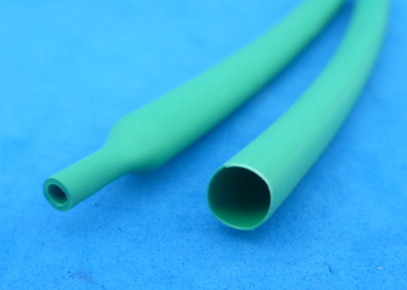 Krimpkous 3:1 Groen. Diameter 6,0 mm, krimpt 3x naar ongeveer een binnendiameter van 2,0 mm. Lengte 2,4 meter. Wanddikte ongeveer 0.25mm, na maximaal krimpen kan dat oplopen tot ongeveer 0,6 mm.