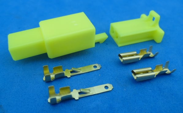 stekker 2.8 mm kompleet, gele male en female behuizing met alle kontakten, 2 polig. Voor draad maximaal 1.0 mm2. Gelijkwaardig aan stekkers gebruikt op Japanse motorfietsen. Reservekontakten:3-2924 (male), 14303-00 (female).
