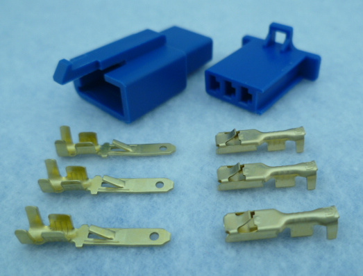stekker 2.8 mm kompleet, blauwe male en female behuizing met alle kontakten, 3 polig. Voor draad maximaal 1.0 mm2. Gelijkwaardig aan stekkers gebruikt op Japanse motorfietsen. Reservekontakten:3-2924 (male), 14303-00 (female).