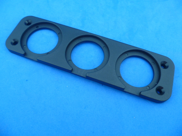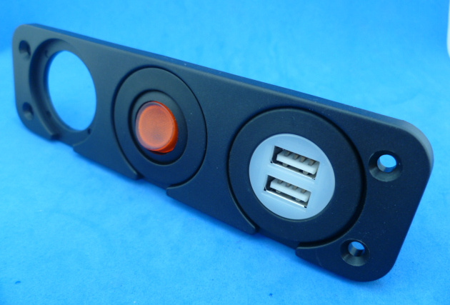 Montageplaat met 3 gaten. Hierin past USB-195 (USB-194PS), 161714 voltmeter en 161716 amperemeter en meer sigaren-aansluitspul. Vier zwarte parkers meegeleverd met verzonken kruiskop. Afm. 151 x 43 mm, 5,6 mm dik. Diameter gaten 29,7 mm. Schroefgaten 4,1 mm voor schroeven met verzonken kop. De diameter van de grotere cirkel waar de flens van het in te bouwen ding in valt is 37,9 mm met een uitsparing voor in veel gevallen het bandje dat aan de afdichtdop zit.