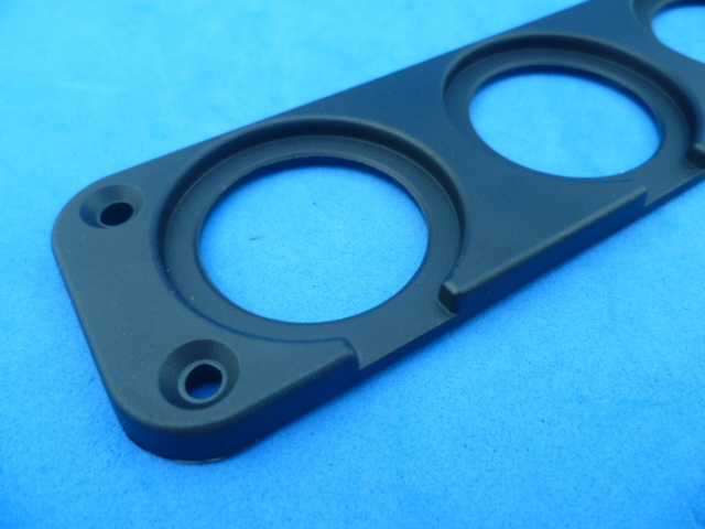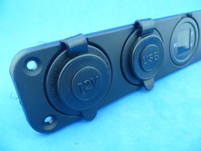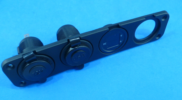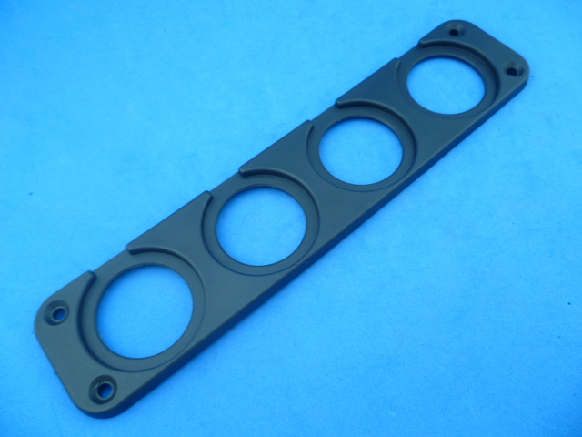Montageplaat met 4 gaten. Hierin past USB-195 (USB-194PS), 161714 voltmeter, 161716 amperemeter, e.v.t. een schakelaar met inbouwring en meer sigaren-aansluitspul. Vier zwarte parkers meegeleverd met verzonken kruiskop. Afm. 195 x 43 mm, 5,1 mm dik. Diameter gaten 29,6 mm. Bevestigings schroefgaten 4,1 mm voor schroeven met verzonken kop. De diameter van de grotere cirkel waar de flens van het in te bouwen ding in valt is 37,6 mm met een uitsparing voor in veel gevallen het bandje dat aan de afdichtdop zit.
