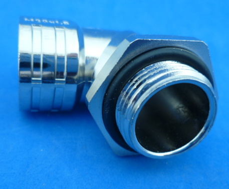 Lapp kabel knieverbinding M20x1,5. Vernikkeld. Waarschijnlijk is dit Lapp kabel artikelnummer 52107821. In dat geval is het materiaal zinklegering vernikkeld. Mooi glanzend zijn ze zeker. Sleutelmaat voor 6-kantmoer is 27 mm. Sleutelmaat aan de kant van de binnendraad is 22 mm.