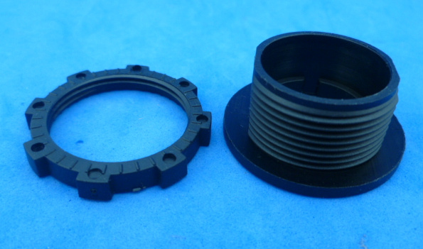 Uitwendige maten van de houder zijn: benodigd inbouwgat 29 mm (met 2 zijdes afgeplat), maximale paneeldikte 8 mm. De grootste diameter van de rand is 36,9 mm. Totale hoogte van het ding is ruim 17 mm.