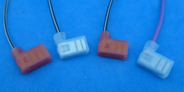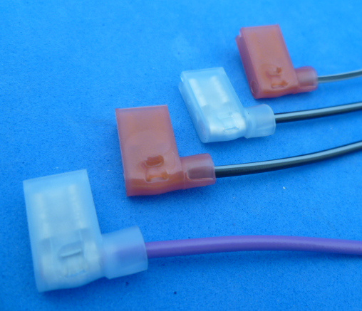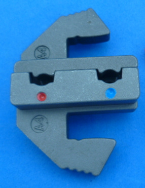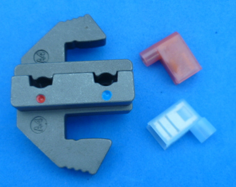 Matrijs voor geisoleerde blauwe en rode flag schuifstekkers. In de webshop met bestelnummers PRR193 en PRU293. Deze matrijs past in de geel/zwarte krimptang JMB-leeg. Vroeger had ik de krimptang PRT7 van Ripca, met blauwe en rode handvaten. (nu heeft Ripca nog steeds PRT7 maar dat is een andere tang en die is slecht, verkoop ik niet meer). Om eerlijk te zijn was ik nooit een fan van deze kabelschoenen en hun tang maar soms komt het van pas. Ik denk dat de krimpverbinding van een rechte kabelschoen beter is. Toch heb ik nooit problemen gehad met mijn oude PRT7 tang. Maar voor grote stromen heb ik de kabelschoenen nooit gebruikt.