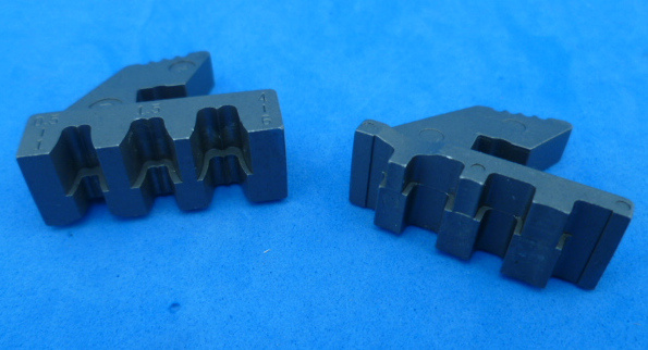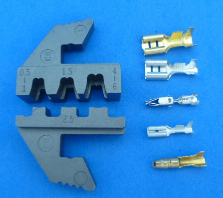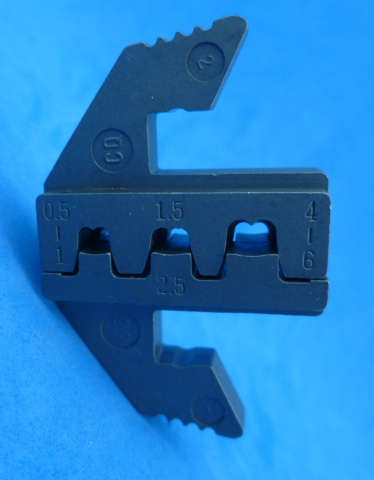 Matrijs voor ongeisoleerde kontakten van 0ngeveer 0,35 t/m 4,0 mm2 voor de geel/zwarte lege krimptang JMB-leeg. Zie de foto's. Op de matrijs staat bij de grootste opening 4-6. Helaas is 6,0 mm2 voor deze tang te groot, werkt NIET. Ook voor 4,0 mm2 werkt het alleen goed met kontakten van dun materiaal zoals 'gewone' 6,3 mm schuifstekkers. Dus kabelogen voor 4,0 mm2 en dikker zijn niet goed te krimpen met deze tang. Wat wel goed gaat is kleine kontakten van relatief dun materiaal met hele dunne draad.