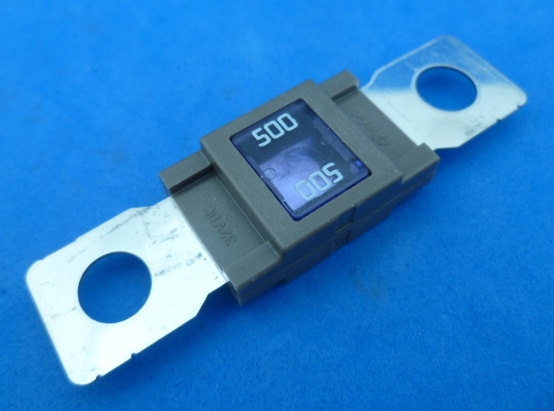 mega zekering 500A . Bruin. Hartafstand boutgaten 52mm. Boutgaten 8mm. Met venster.