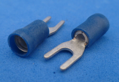 vork 3.6 mm blauw voor 1,5 - 2,5 mm2 draad. Opening in de vork is 3,6 mm. Uitwendig 6,5 mm breed. Materiaaldikte 0,75 mm.