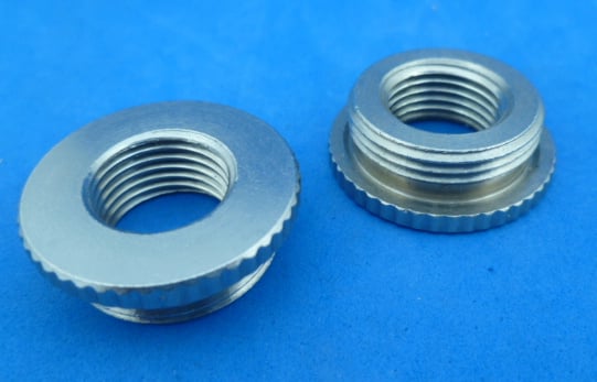 Messing vernikkelde reduceerring, M25 buitendraad, M16 binnendraad. Kartelrand. Totaal 10,1 mm hoog. Grootste diameter 30,05 mm. Geen rubber o-ring.
