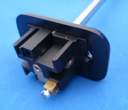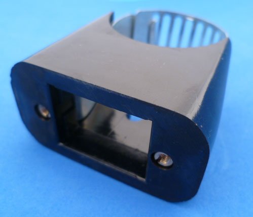 Schakelaar voor richtingaanwijzer met 3 schroefaansluitingen voor de draden tot 2,5 mm2. Is bedoeld voor montage op een 40 mm ronde buis door middel van een klembandje. De lengte van de steel is ongeveer 12 cm. Bij montage op een ronde buis is de afstand buis - einde steel ongeveer 16 cm. De klemband wordt aangespannen door middel van de twee schroeven te zien op foto 4. Het zal zeker nodig zijn om zelf een of andere oplossing te bedenken die bij montage op een ronde buis het meedraaien voorkomt. Want bij te vast aandraaien gaat het zeker fout.