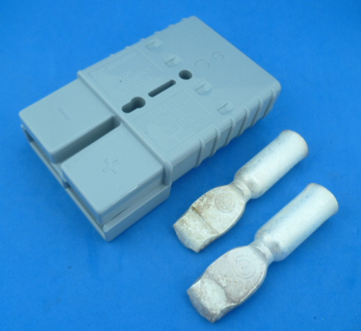 Grijze Anderson stekker 350A - 600V met kontakten. De kontakten zijn te krimpen maar ook te solderen. Deze stekker is zowel mannetje als vrouwtje, 2 dezelfde grijze stekkers passen op elkaar. Andere kleuren hebben een andere pasvorm en passen niet op elkaar.