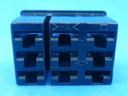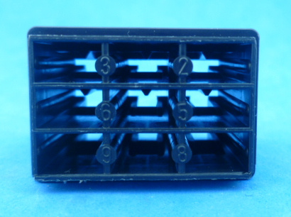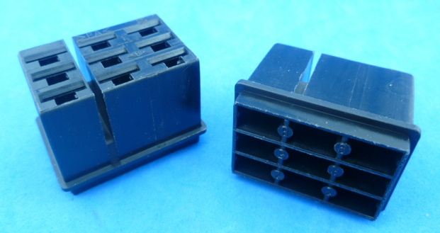 Zwart leeg stekkerblok 9 polig. LET OP, dit is maar 1 stekkerhuis, de foto is van voorkant en achterkant. Hierin passen 'normale' 6,3 mm schuifstekkers met weerhaakje, in mijn webshop zijn dat bestelnummers die beginnen met 3-2922.