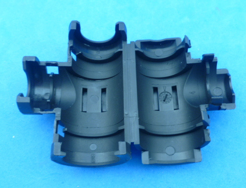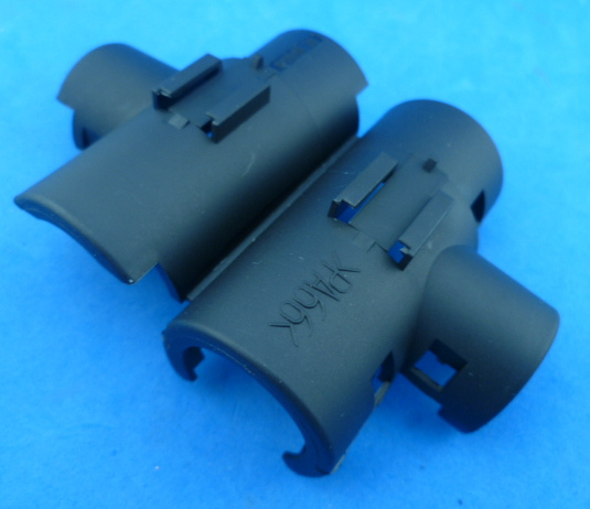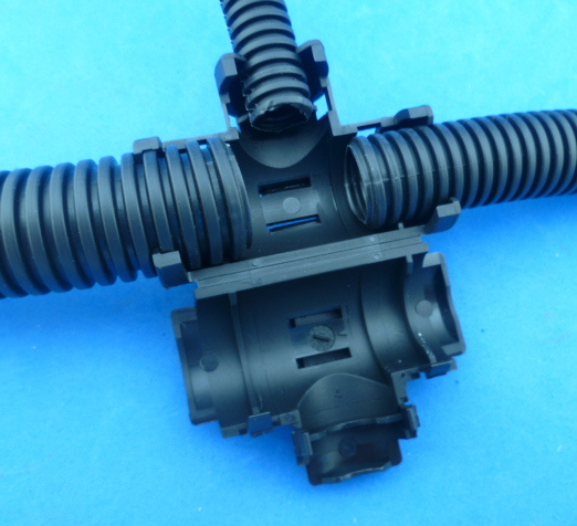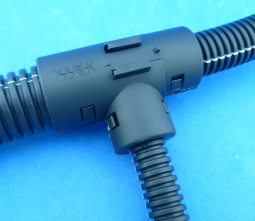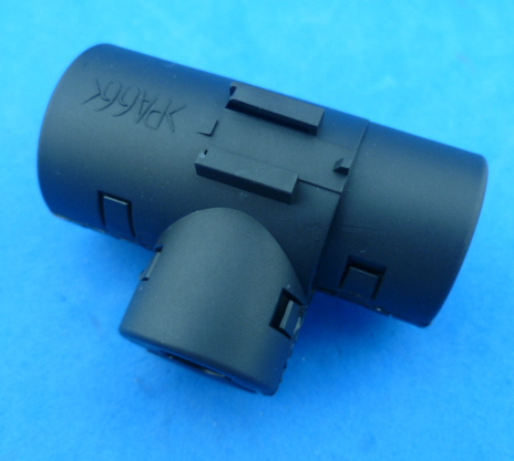 Haaks T-stuk voor (N)SCT19, (N)SCT13 en (N)SCT9 flexibele geribbelde slang. De ingangen van de rechtdoor lopende slangen zijn 19 en 13, de aftakking is 9. Is eenvoudig dicht te klikken over de slangen, de slang wordt vastgehouden, schiet er niet meer uit. Ook redelijk eenvoudig weer te openen.