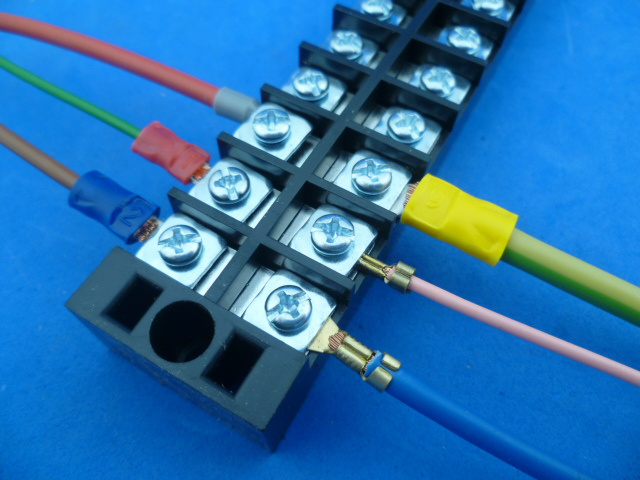 600 / 25A. Afmetingen 165 x 30 x 19 mm. Twee 4 mm montagegaten, hartafstand 154 mm. De schroeven om de draden vast te schroeven zijn 4 mm, met kruiskop- of gleuf schroevendraaier aan te draaien. Als er een kabelschoen onder gaat mag die maximaal 10 mm breed zijn. Twee op elkaar is ook geen probleem. De schroef kan er helemaal uit dus een oogje eronder kan ook. Maar soms is het zoeken van verloren schroeven niet eenvoudig dus een vorkje is beter. Niet echt vakwerk maar een 'kale' draad vastschroeven gaat ook. Ik heb getest op goed lomp vastschroeven en die test is goed doorstaan ...