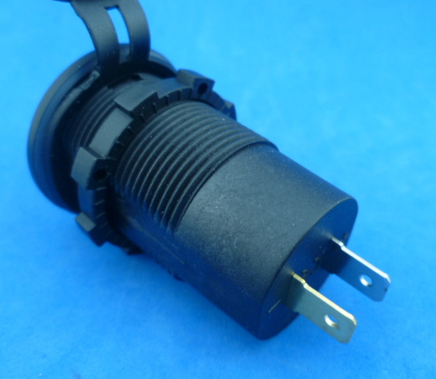 Aansluiten met gewone 6,3 mm schuifstekkers. Is in te bouwen in rond gat 29 mm, bevestiging met moer. Het inbouwpaneel mag maximaal 25 mm dik zijn. Inbouwdiepte is ongeveer 57 mm (zonder stekkers achterop). Afsluitdop aan bandje. Je kunt de dop ook weg laten.